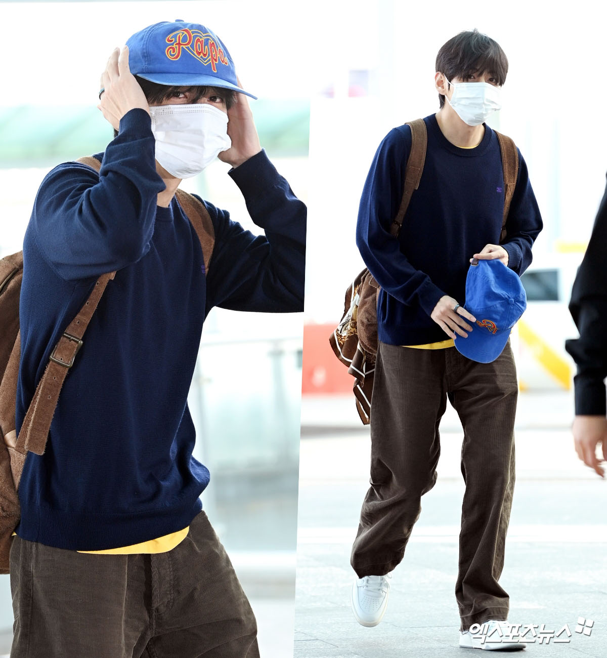 V showcased a calm yet classic look, pairing a navy knit with brown corduroy pants. He added a clean touch with white sneakers, while a color-coordinated backpack and scarf offered both practicality and style. A blue ball cap completed the chic ensemble.